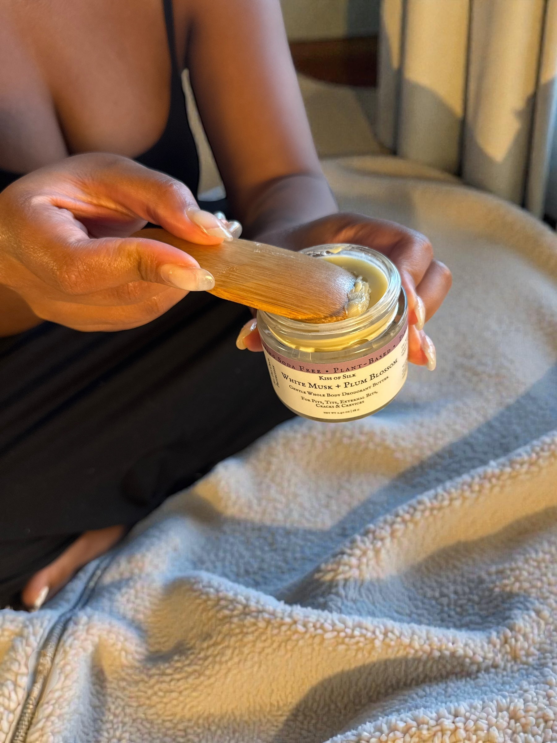 White Musk & Plum Blossom Whole Body Deodorant Butter is a creamy, aluminum-free deodorant designed for odor control anywhere on the body — not just underarms.